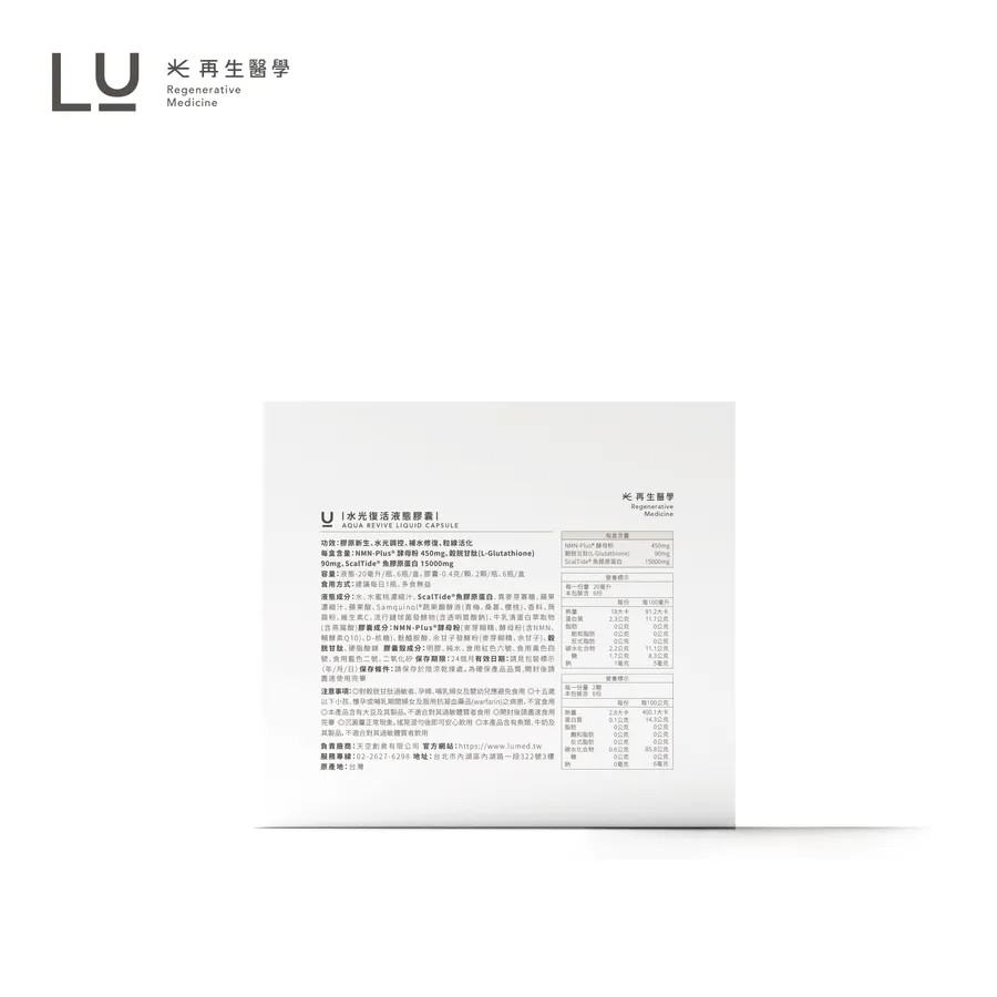 每盒含量:NMN-Plus® 酵母粉 450mg、穀胱甘肽(L-Glutathione) 90mg、 ScalTide® 魚膠原蛋白 15000mg